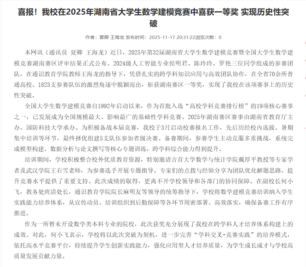 近日,2025年第32届湖南省大学生数学建模竞赛暨全国大学生数学建模竞赛湖南赛区评审结果正式公布。2024级人工智能专业侯明君、陈玲玲、罗艳三位同学组成的参赛团队,在通识教育学院教师王海龙的指导下,凭借扎实的跨学科知识应用与高效团队协作,在全省70余所普通高校、1823支参赛队伍的激烈角逐中脱颖而出,斩获湖南赛区一等奖,实现了我校在该项赛事上的历史性突破。