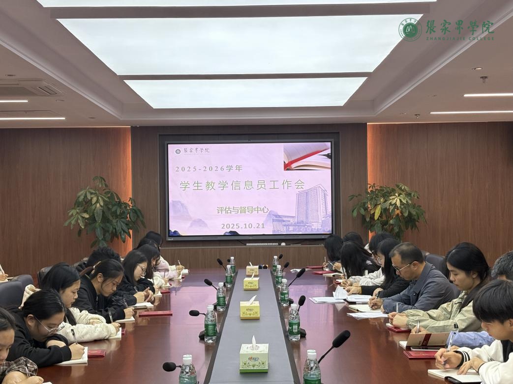10月21日,张家界学院在望岳楼修远厅召开2025-2026学年学生信息员工作会议。会议围绕本学年教学信息反馈与管理工作展开,评估与督导中心主任陈善敏出席会议,评估与督导中心相关教师、全体学生信息员共同参会。此次会议由评估与督导中心汤友莲主持