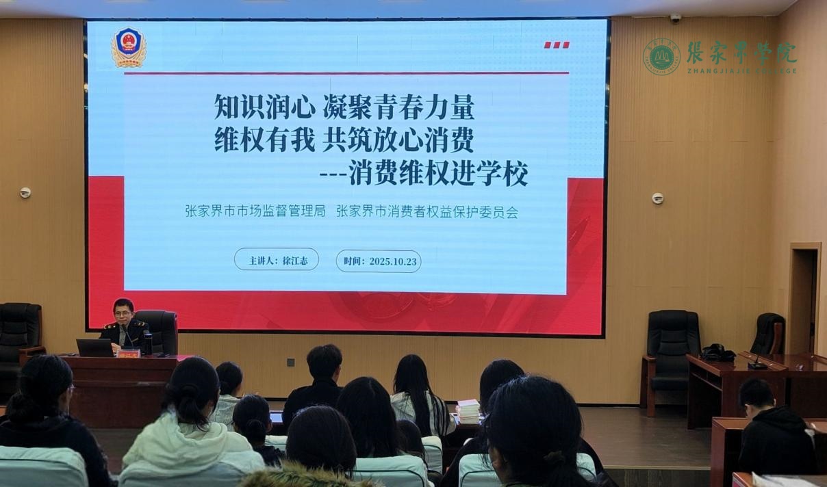 为在校学生普及消费权益相关知识,帮助大学生提升消费风险防范意识与依法维权能力。10月23日下午,张家界学院在望岳楼诸子厅开展以“知识润心,凝聚青春力量;维权有我,共筑放心消费”为主题的消费维权专题讲座。本次讲座特邀张家界市市场监管事务中心副主任徐江志担任主讲人。由学生工作部万肖晨昱老师主持。