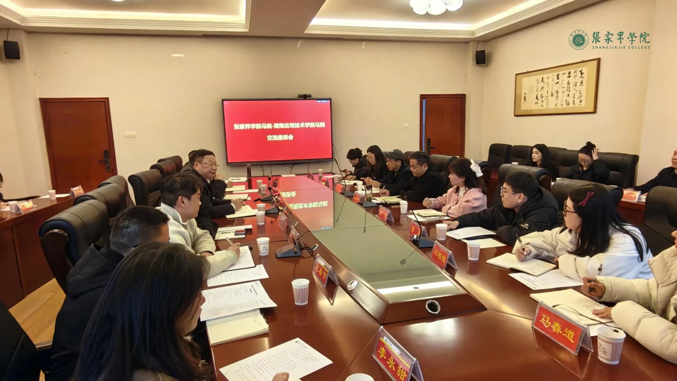 近日,张家界学院马克思主义学院(法学院)与湖南应用技术学院马克思主义学院在博学楼会议室举行交流座谈会。双方聚焦新时代马克思主义学院内涵建设与发展路径,围绕思政课教师队伍建设、教学改革深化、人才培养模式创新及党建与业务融合等议题展开交流。座谈会由张家界学院马克思主义学院(法学院)院长唐华山主持。