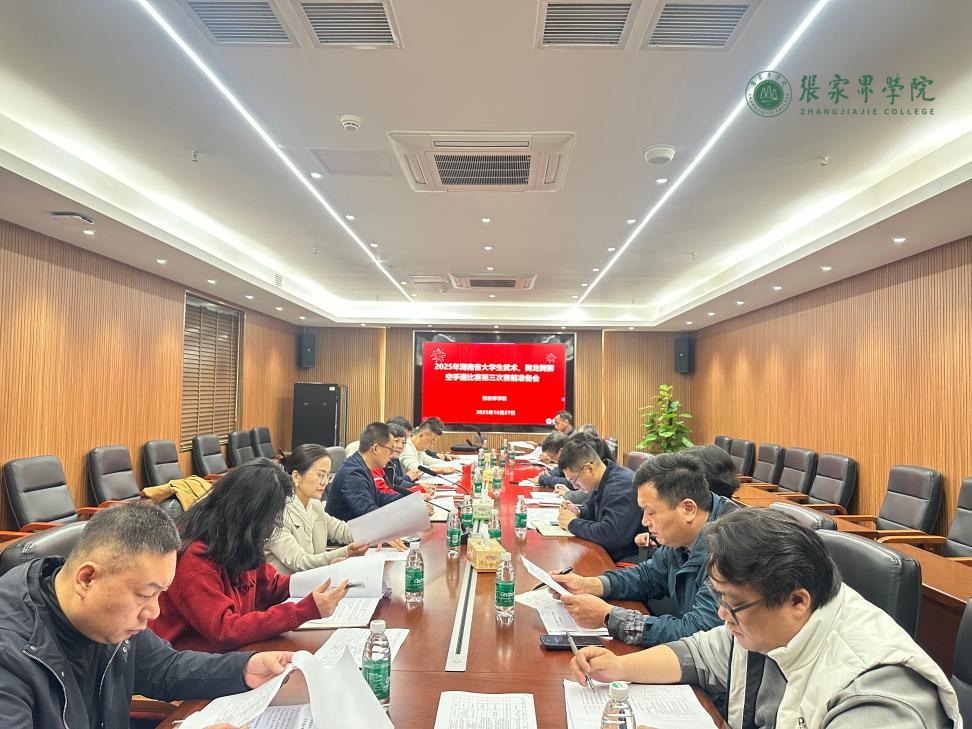10月27日,2025年湖南省大学生舞龙舞狮、空手道、武术比赛第三次赛前准备会在学校望岳楼达观厅召开。张家界学院副校长向江主持会议,学校相关职能部门负责人及体育与健康学院部分教师参会。