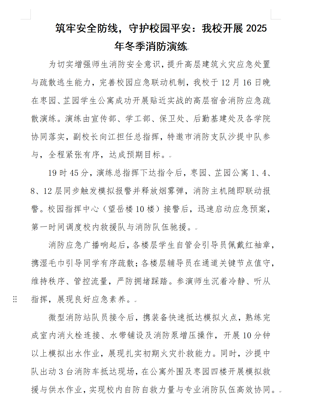 为切实增强师生消防安全意识,提升高层建筑火灾应急处置与疏散逃生能力,完善校园应急联动机制,我校于12月16日晚在枣园、芷园学生公寓成功开展贴近实战的高层宿舍消防应急疏散演练。演练由宣传统战部、学工部、保卫处、后勤基建处及各学院协同落实,副校长向江担任总指挥,特邀市消防支队沙提中队参与,全程紧张有序,达成预期目标