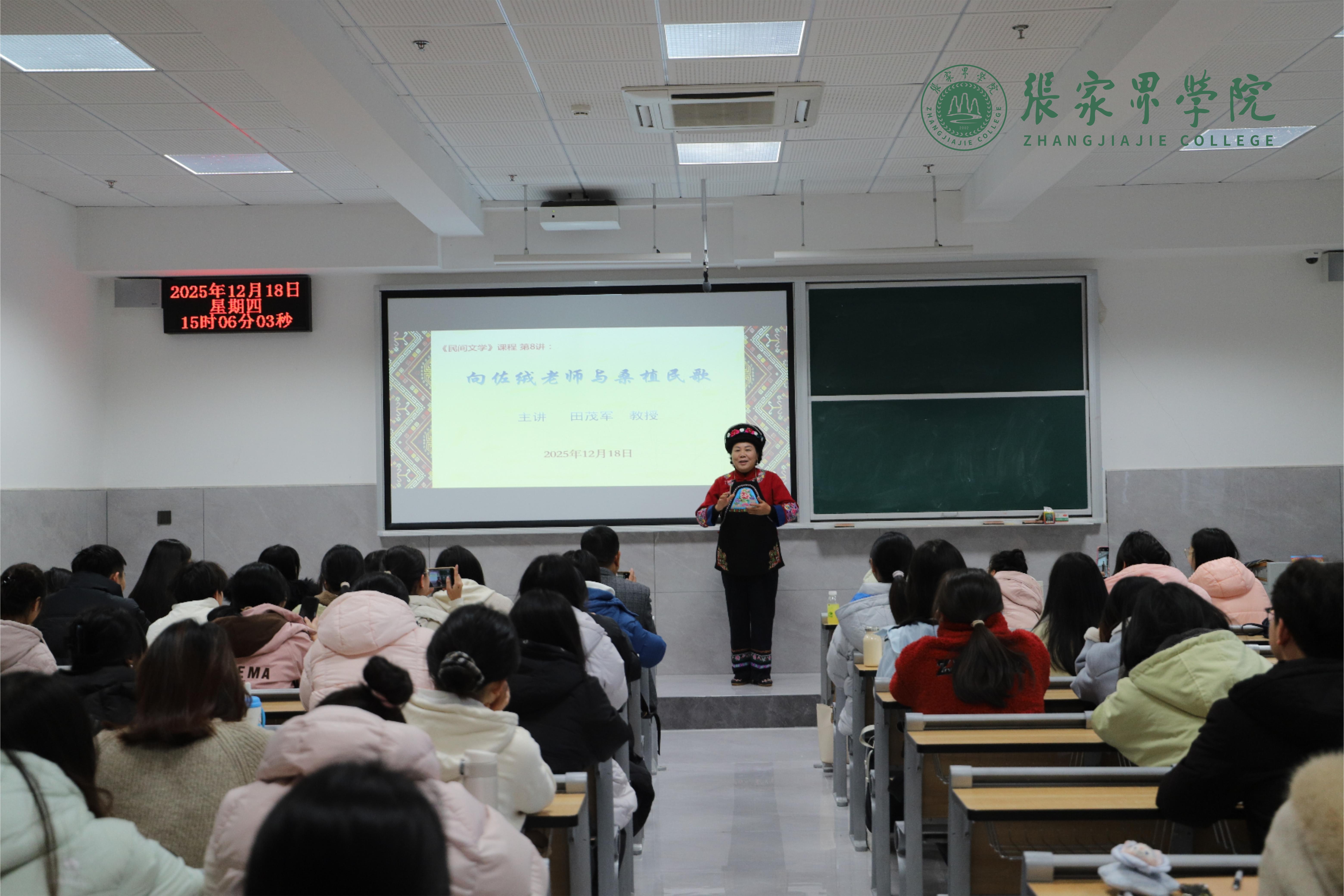 “韭菜开花细绒绒,有心恋郎不怕穷。只要二人情义好,冷水泡茶慢慢浓。”12月18日下午,张家界学院文学院田茂军教授特邀年近七旬的国家级非物质文化遗产桑植民歌代表性传承人向佐绒走进他的《民间文学》课堂,通过对桑植民歌的细致讲解和深情演唱,为104位同学带来了一场沉浸式的民歌体验,帮助青年学子在悠扬旋律中读懂民间文学的生命力,在非遗传承中厚植文化自信。