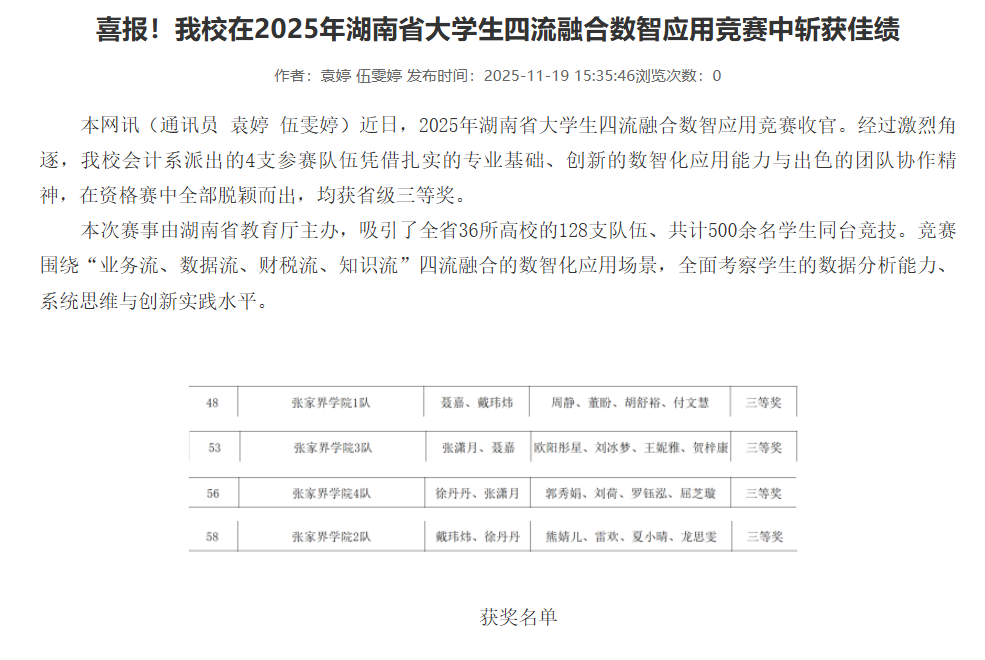 近日,2025年湖南省大学生四流融合数智应用竞赛收官。经过激烈角逐,我校会计系派出的4支参赛队伍凭借扎实的专业基础、创新的数智化应用能力与出色的团队协作精神,在资格赛中脱颖而出,均获省级三等奖。