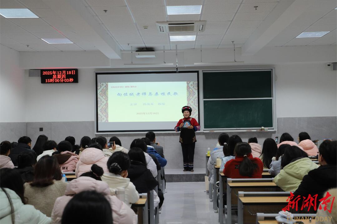 “韭菜开花细绒绒,有心恋郎不怕穷。只要二人情义好,冷水泡茶慢慢浓。”近日,张家界学院文学院特邀年近七旬的国家级非物质文化遗产桑植民歌代表性传承人向佐绒走进《民间文学》课堂,通过对桑植民歌的细致讲解和深情演唱,为104位同学带来了一场沉浸式的民歌体验,帮助青年学子在悠扬旋律中读懂民间文学的生命力,在非遗传承中厚植文化自信。