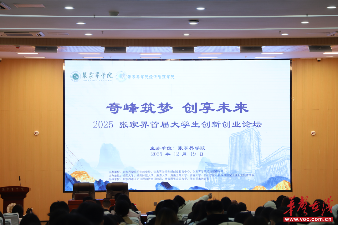 12月19日,以“奇峰筑梦 创享未来”为主题的2025年张家界首届大学生创新创业论坛在张家界学院举行。来自清华大学、中国人民大学等省内外高校的专家学者,以及融源控股集团有限公司、湖南百铖企服信息科技有限公司、阿凡达(湖南)科技有限公司等30余家省内外企业与机构代表,以及9位张家界学院优秀校友齐聚现场,为论坛带来创新创业前沿理念与产业实践经验。
