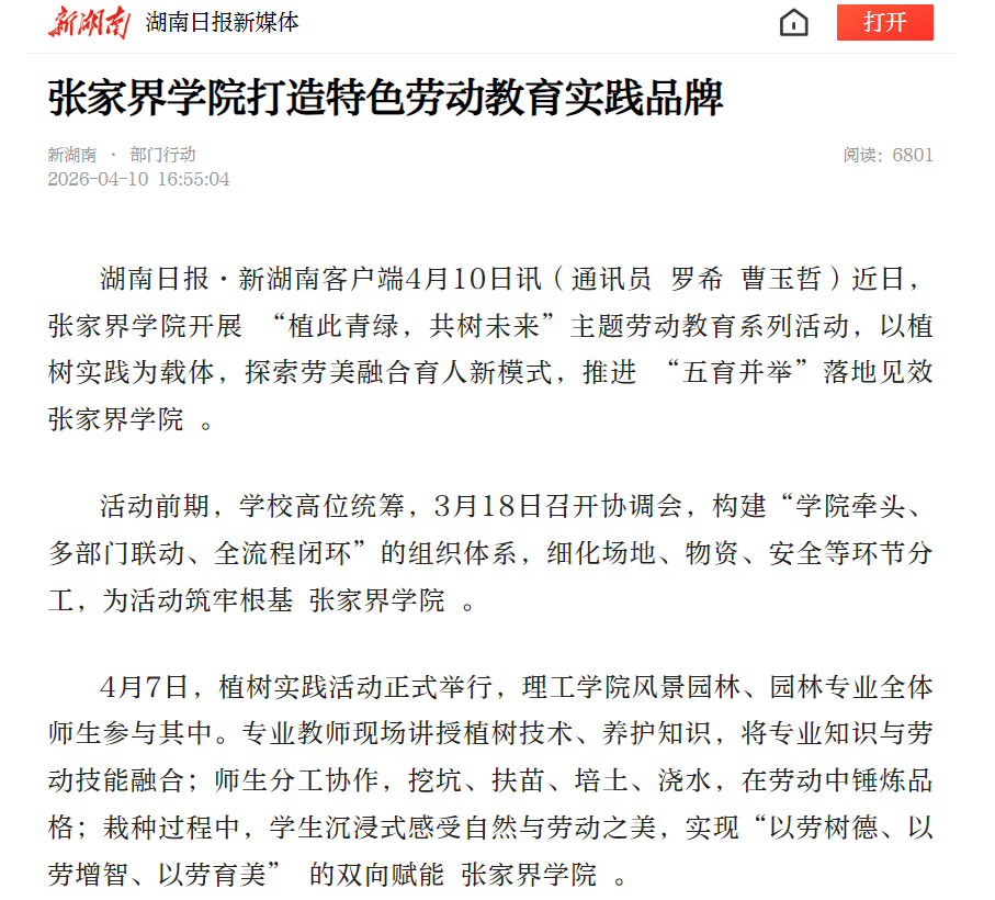 近日,张家界学院开展 “植此青绿,共树未来”主题劳动教育系列活动,以植树实践为载体,探索劳美融合育人新模式,推进 “五育并举”落地见效 张家界学院 。