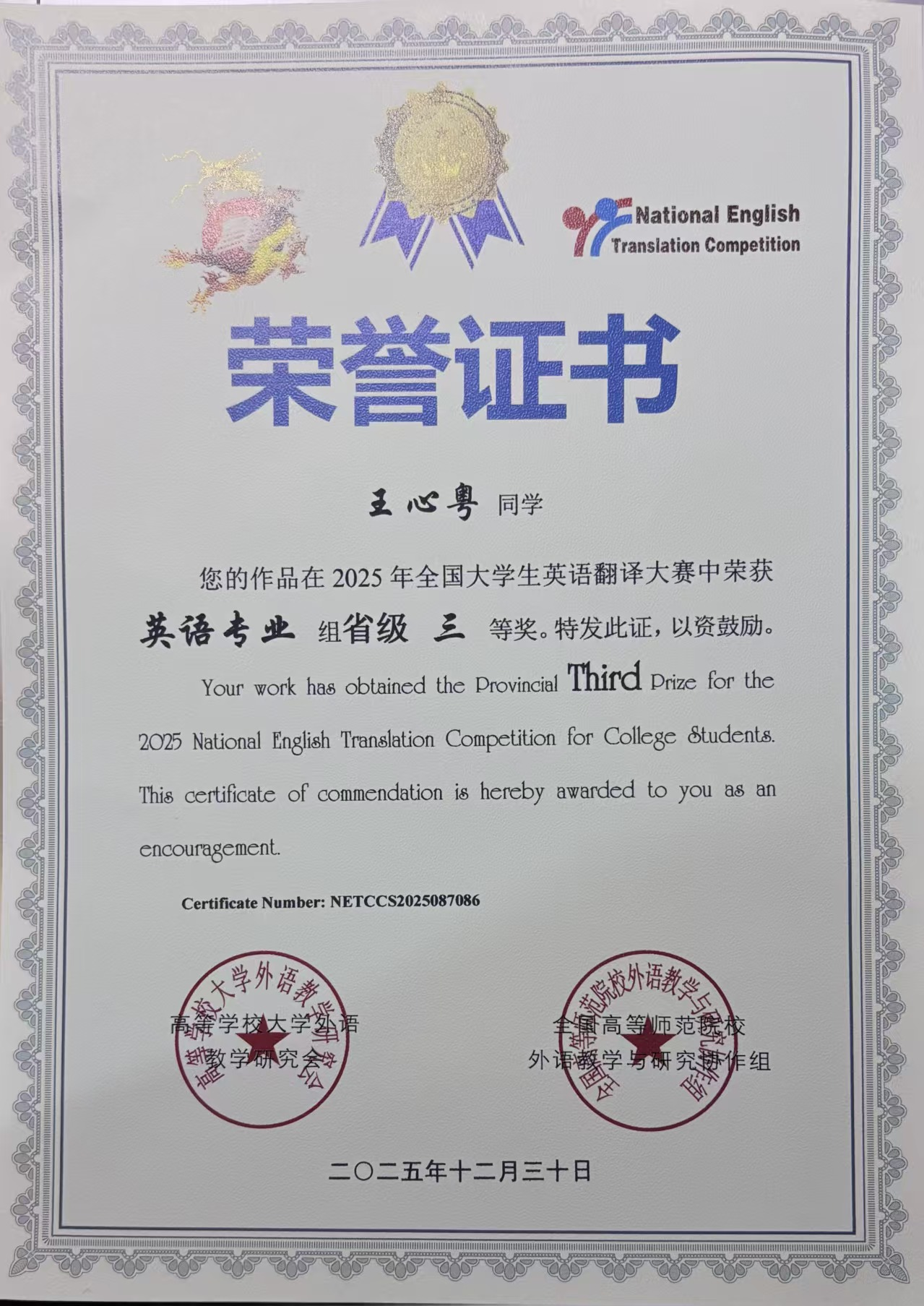 2025年全国大学生英语翻译大赛上,25级英语2班的大一新生王心粤,一举斩获英语专业组省级三等奖,用实力证明:大一新生,也能在全国性赛场“翻”出属于自己的精彩。