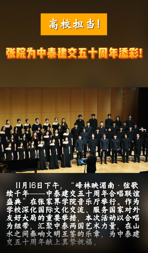 11月16日下午,“峰林映湄南·弦歌续千年——中泰建交五十周年合唱联谊盛典”在张家界学院音乐厅举行。中泰两国合唱团体以歌为媒,共叙建交五十周年的深厚情谊。泰华文化教育基金会副主席、泰国乐运合唱团团长何韵,国家一级演员、前中央乐团合唱团团长、泰国乐运合唱团艺术指导兼指挥肖铭炎,张家界学院校长简德彬,副校长范本祁,董事会秘书姚星明以及各二级单位主要负责人参加活动。