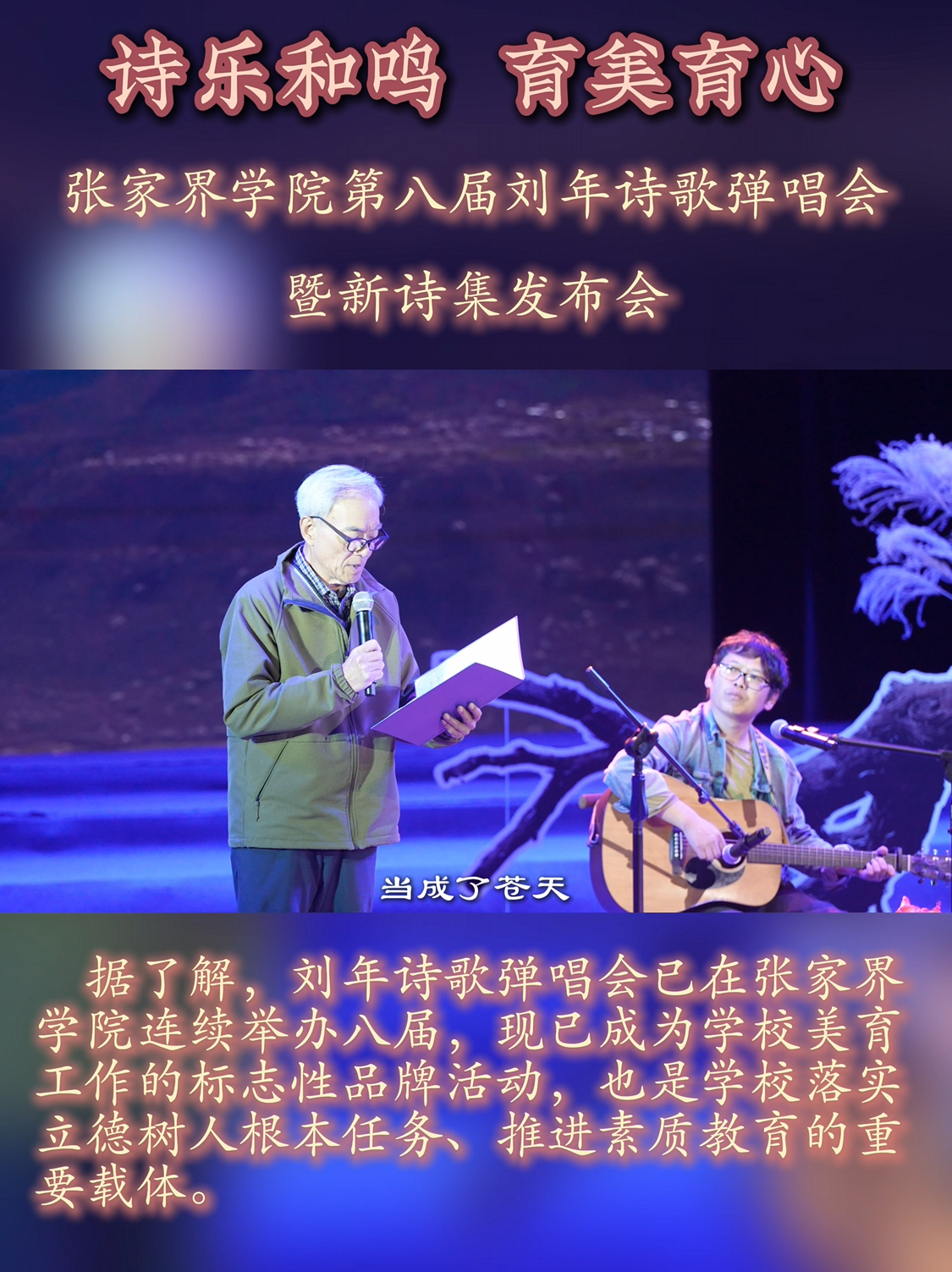 诗乐和鸣,育美育心:张家界学院第八届刘年诗歌弹唱会暨新诗集发布会在学校风雅厅举行。